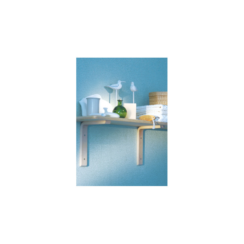 Jednoduché konzoly z ohýbané překližky, úzké a jemné. Světlá barva bukového dřeva způsobuje, že se zvlášť dobře hodí k policím vyrobeným ze stejného materiálu. Surové dřevo, ze kterého byly vyrobené, lze snadno natřít na libovolnou barvu lakem, barvou nebo mořidlem.