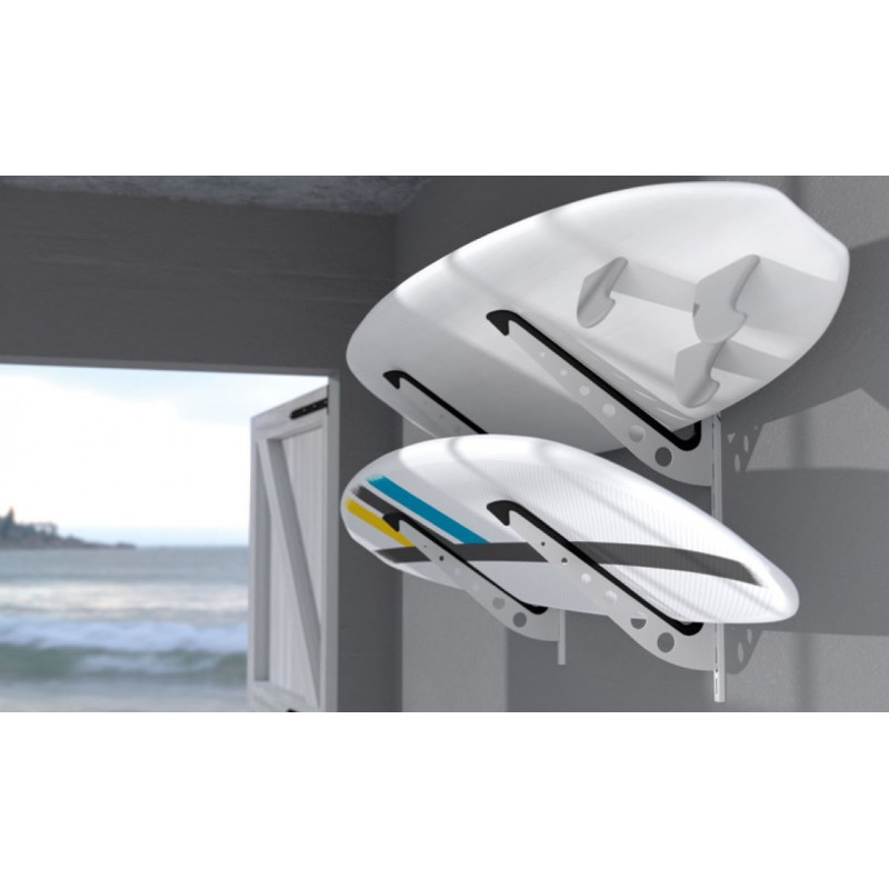 Nástěnný držák pro uložení různých typů sportovních prken, jako jsou surfy, SUP a snowboardy.