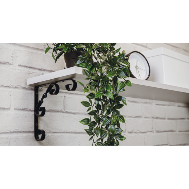 Dekorativní konzoly z oceli. Úzké a jemné, způsobují dojem lehkosti a diskrétně zdůrazňují estetiku konstrukce s policí.