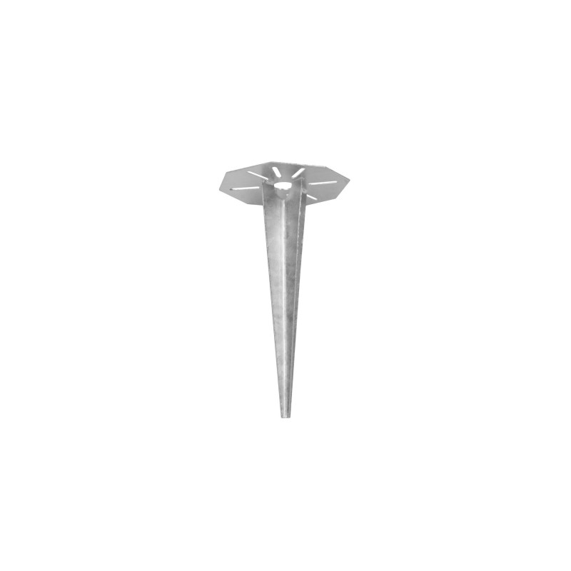 Patka k zaražení - pro ukotvení zahradních lamp a elektrických zásuvek přímo do země. Verze s osmihrannou montážní deskou, deska má řadu podlouhlých otvorů umožňujících montáž prvků. V horní části základny je speciální otvor pro elektrické dráty.