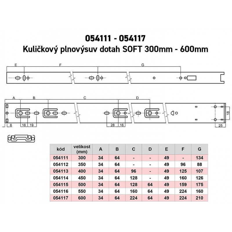Výsuvy jsou baleny v kartonu po 10 sadách, jejich výška je 45,3 mm, šířka 12,7 mm a nosnost 45 kg.