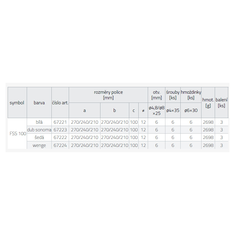 Sada se skládá ze 3 polic, sady šroubů ø4x35 a montážních hmoždinek ø6x30 pro upevnění do zdi.