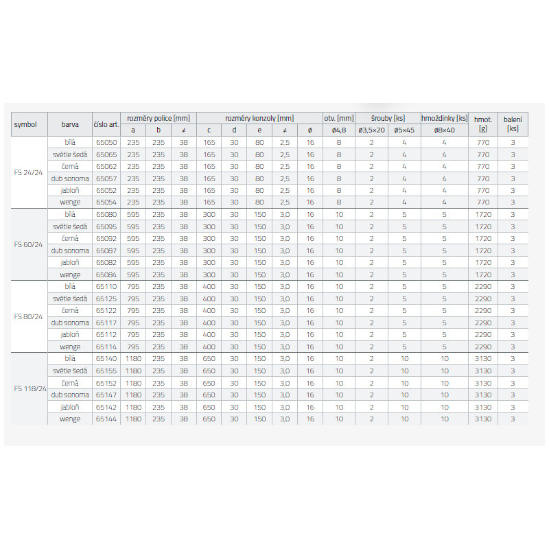 Sada se skládá z police, konzol a sady šroubů ø3,5x20, ø5x45 (včetně barevných krytek pro zakrytí otvorů) a montážních hmoždinek ø8x40 pro upevnění do zdi.