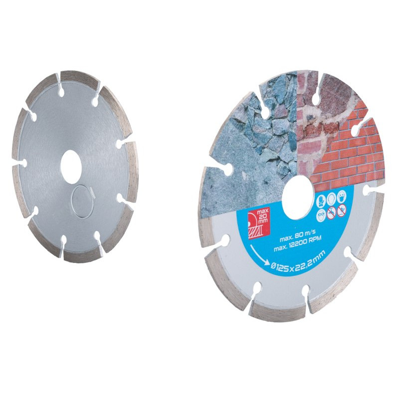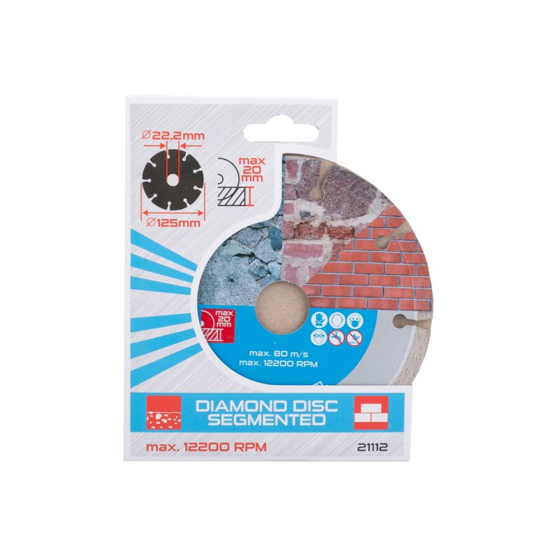 Diamantový kotouč DIAMANT, určený pro suché řezání betonu, cihel, zdiva, kamene, vysoce pevné uchycení diamantových segmentů k nosnému disku kotouče, vysoký obsah diamantového prachu, průměr otvoru 22,2 mm. Součástí balení je redukční kroužek z 22,2 na 20 mm.