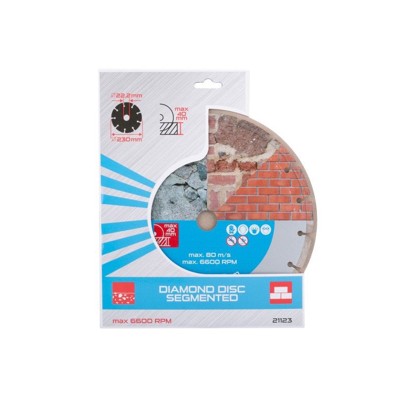 Diamantový kotouč DIAMANT, určený pro suché řezání betonu, cihel, zdiva, kamene, vysoce pevné uchycení diamantových segmentů k nosnému disku kotouče, vysoký obsah diamantového prachu, průměr otvoru 22,2 mm. Součástí balení je redukční kroužek z 22,2 na 20 mm.