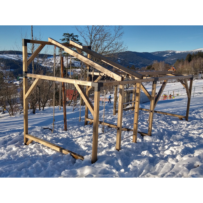 4. Provoz: Po montáži je konstrukce připravena k zamýšlenému použití. U houpaček zajistěte rovnoměrné rozložení hmotnosti a nepřekračujte povolené zatížení stanovené výrobcem dřevěných prvků. Poznámka: Nosnost závisí na použitých dřevěných materiálech a způsobu montáže. Doporučuje se provést kontrolu konstrukce před každým použitím – zejména po zimním období nebo silných deštích.