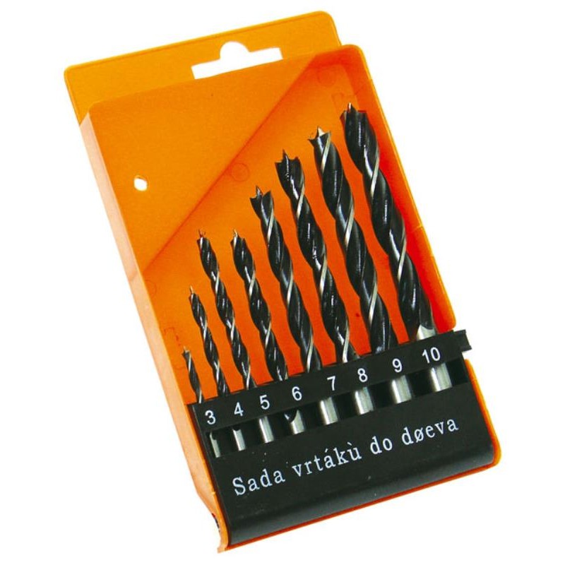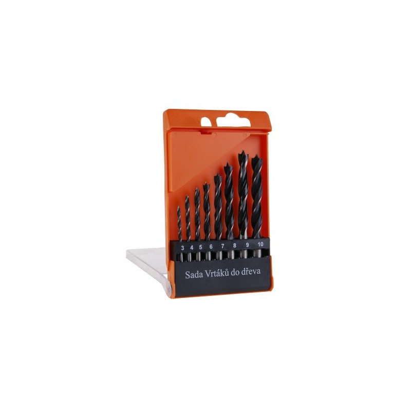 Vrtáky jsou uloženy v plastové krabičce.