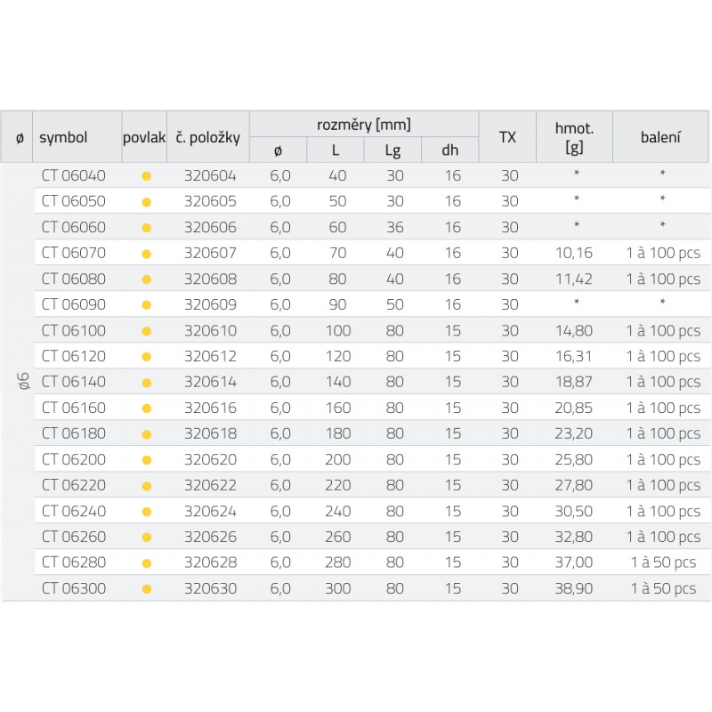 | Průměr | 6 mm přes závit, hlava 14 mm |
