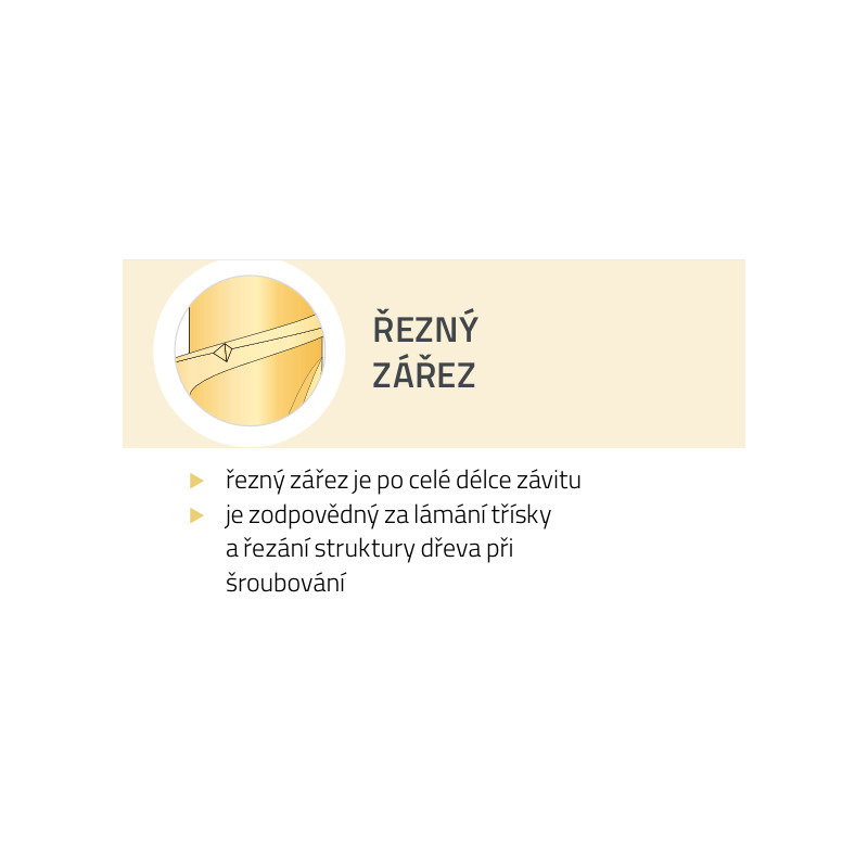 3. Řezné rýhy - lámou třísky vznikající při šroubování a brání rozštípnutí dřeva;
