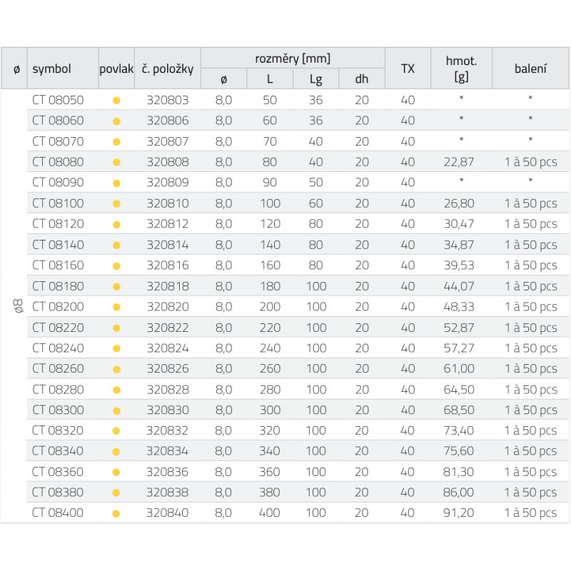| Průměr | 8 mm přes závit, hlava 23 mm |